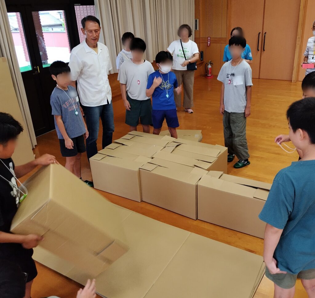 その後は同校区自主防災会との意見交換会を行い、ダンボールベッド作成を行い、避難所生活を体験しました。